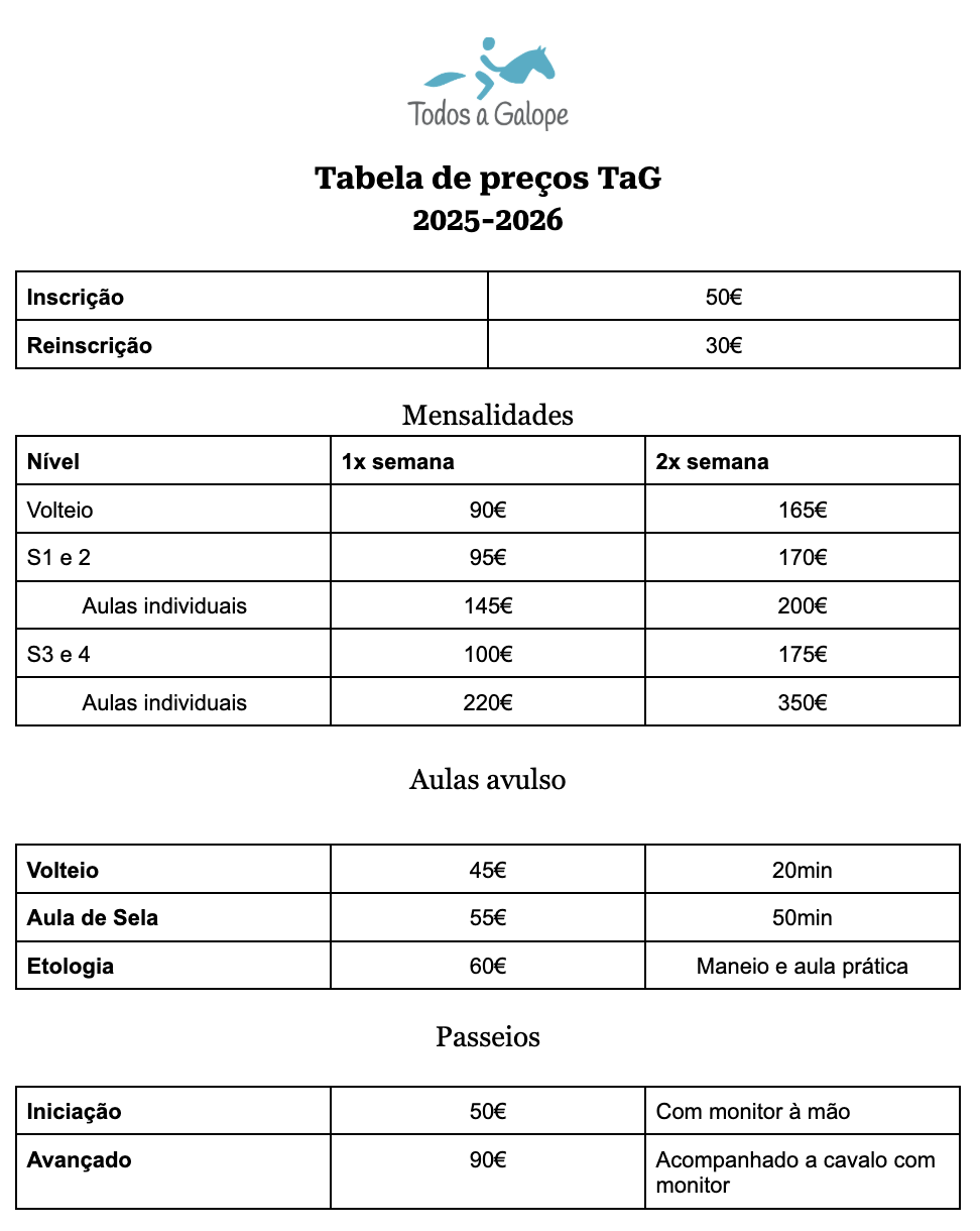 Entre essas novidades, destacamos com particular entusiasmo a nova oferta de meia pensão de um cavalo, uma excelente oportunidade para alunos que desejam aprofundar a sua experiência e ligação com um cavalo em regime mais regular. Todas as condições e critérios de acesso a este regime encontram-se especificados no regulamento.